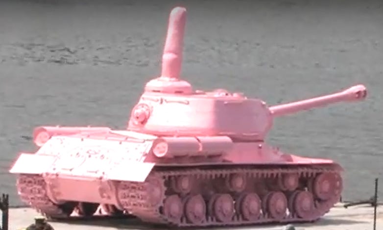 The artist, David Cerny, was arrested for hooliganism, and under pressure from the Kremlin, officials had the tank repainted its original color. In protest of Cerny’s arrest, some parliament members with diplomatic immunity repainted it pink. It went through this cycle every couple of weeks- army green, baby pink, army green, baby pink. Status quo, push back, status quo, challenge, status quo, defiance.
