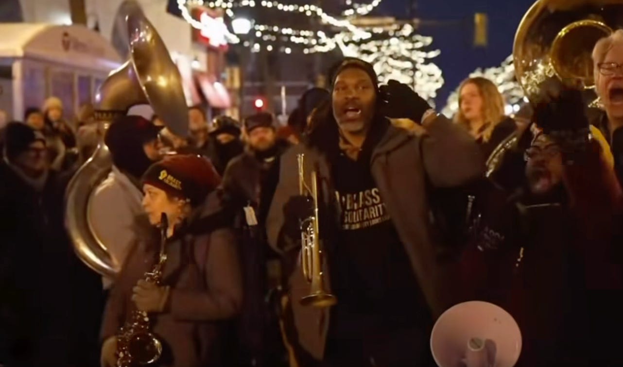 Minneapolis is also calling back to its recent protest history with local musicians. A brass band that formed during the George Floyd protests is actively out and about at marches. They played I’ll Be There and I’ll Fly Away as throngs of comrades sang along at Alex Pretti’s outdoor nighttime memorial.