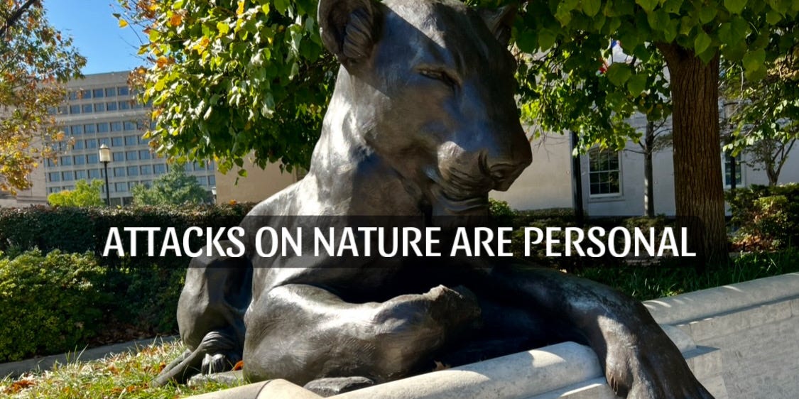 Government leaders and private interests pounce on that perception of distance from nature. They use it to assert that it is okay if only part of a forest is destroyed. Or to say that as long as a species isn’t in danger of going extinct from the planet, that everything is fine.